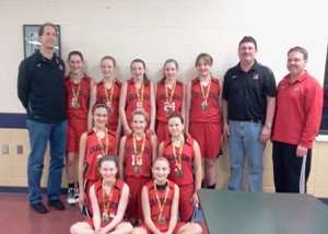 The 7th grade Jr. Charger girls’ basketball team took first place in the Cooney Classic which was held February 4, 2012 in Oconomowoc. Players on the team are (from left, bottom row) Katelyn Hamilton, Macy Williams (middle row) Natalie Pena, Melissa Schweigert, Abby Shane, (top row) Coach Jim Sumiec, Lauren Walsh, Samantha Glendenning, Megan Schmitt, Ellie Sumiec, Lexi Gaatz, Coach Jay Walsh, Coach Brad Williams  |