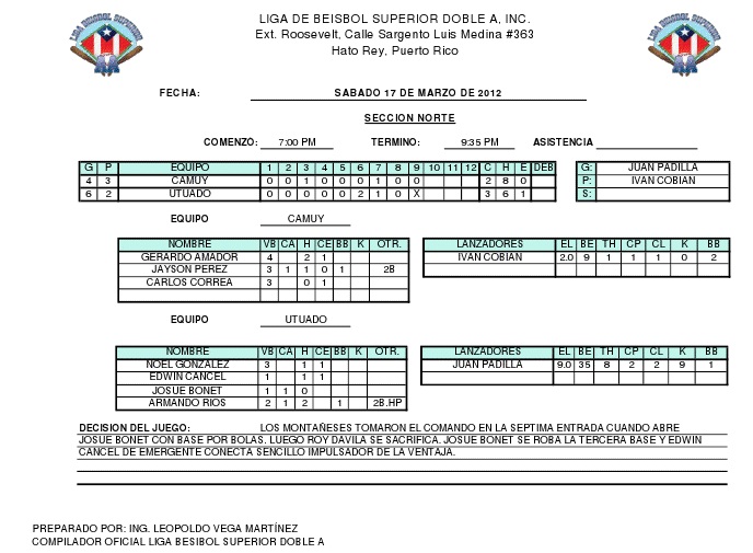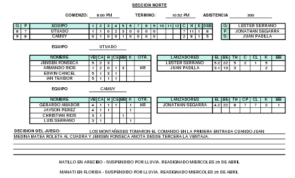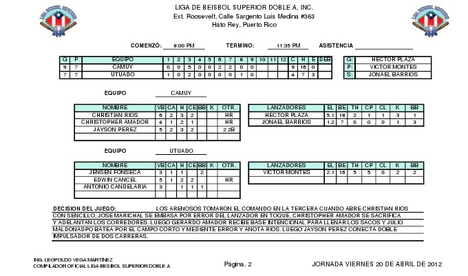 En la acción del sábado 21 de abril, los Montañeses de Utuado dominaron a nuestros Arenosos de Camuy al son de 7 carreras por 2. Hay que destacar la buena labor monticular de los nuevos Arenosos Kaleth Fradera & Frank Pagan, así como el que Gerardo "Jerry" Amador conectó su 7mo cuadrangular de la temporada.