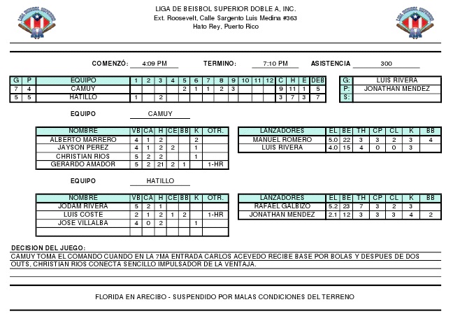 Los arenosos de Camuy derrotaron en la acción del sábado a los Titanes de Florida 6 carreras por 0. En gran labor monticular de Manuel Romero & Jonael Barrios quienes no permitieron libertades a los titanes.Los Arenosos conectaron 10 hits y cometieron 2 errores, mientras que los Titanes conectaron 5 hits. Por Camuy: Julio Maldonado 3-2, HR, 1RBI; Alberto Marrero 3-2, HR, 3RBI