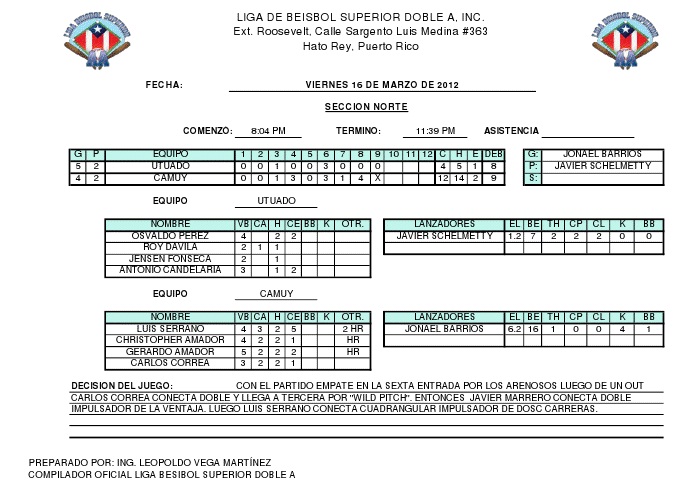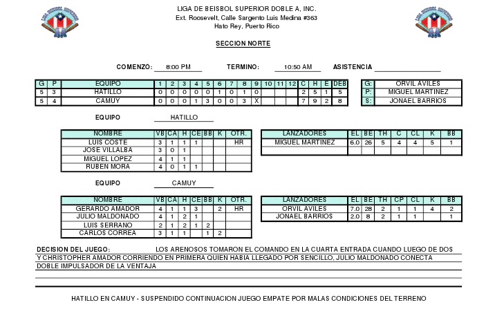 En la parte alta de la décima, el inicialista camuyano Julio Maldonado conectó imparable remolcador de dos carreras en la parte alta de la décima. Los Arenosos (11-5) anotaron dos más y no cedieron carreras en la parte baja, para llevarse el triunfo.