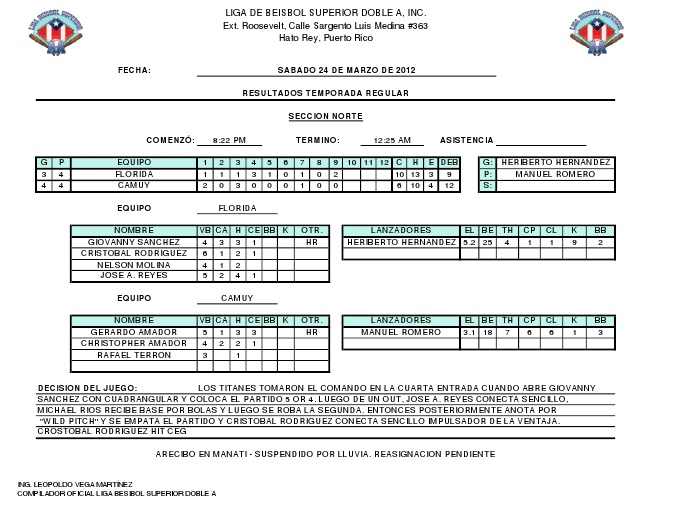 En la acción del Sábado 24 de marzo, los Titanes de Florida salieron de su mala racha al vencer a los Arenosos de Camuy 10 carreras por 6, en el primer partido oficial entre estos equipos. Camuy pone su récord en 4 ganados 4 perdidos, mientras que Florida tiene 3 ganados - 4 perdidos. La victoria fue para Heriberto Hernández y la derrota para Manuel Romero. Por Camuy; Jerry Amador conecto cuadrangular y impulso 3 carreras.