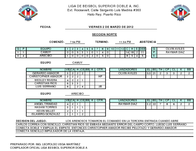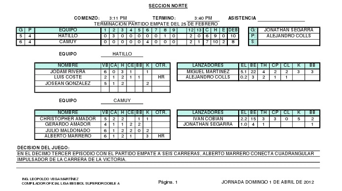 En la acción de sábado 31 de marzo los Arenosos de Camuy dominaron 7 carreras por 2 a los Tigres de Hatillo. Camuy tomó la ventaja del partido en la cuarta entrada cuando Christopher Amador corre en primera base luego de outs y Julio Maldonado conecta Doble impulsador de la primera carrera del juego. La victoria fue para el zurdo Orvil Avilés, quien lanzo por espacio de 7 entradas, enfrento 28 bateadores, permitió 2 hits y 1 carrera, 4 K y 2BB. Esta es la segunda victoria de Avilés en tres salidas para colocar su record en 2-0. La derrota cayó sobre Miguel Martínez que permitió 4 carreras en 6 entradas lanzadas, mientras que el arenosos Jonael Barrios se apuntó su segundo juego salvado del torneo.