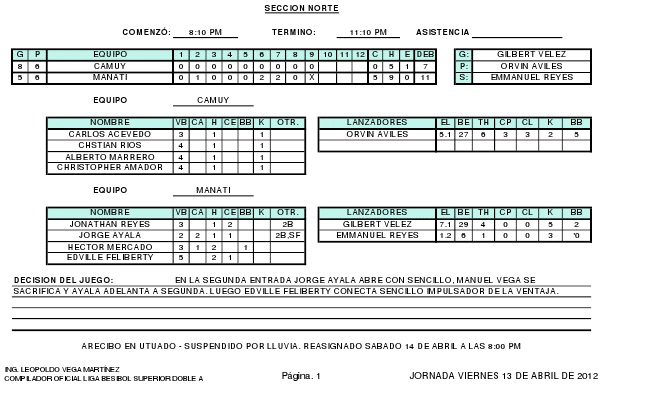 En la accion del Viernes 13 de abril, los Atenienses de Manati vencieron a los Arenosos de Camuy via blanqueada. La victoria fue para Gilbert Aviles, mientras que el juego salvado fue para Emanuel Reyes. La derrota cayo sobre el arenoso Orvil Aviles.