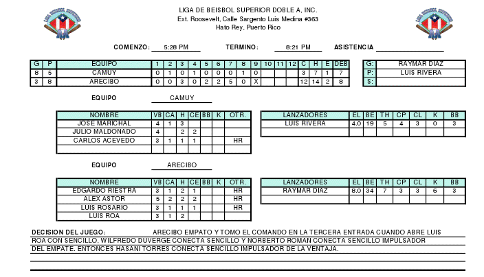 En un dramático partido el sábado, frente a la mirada de casi mil personas, la ofensiva camuyana doblegó a los montañeses. El juego fue ganado por el camuyano Manuel Romero, quien en cinco entradas permitió cuatro carreras y propinó igual número de ponches, perdido por Victor Montes. Nuevamente el juvenil lanzador Jonael Barrios salvó el juego, lanzando por espacio de 1.2 entradas, donde ponchó a un bateador y permitió 3 hits y 2 carreras. Por Camuy, Carlos Correa (3-1, 1CA, HR, 2RBI, 2K) Julio Maldonado (4-2, 1CA, HR, 2RBI) y Javier Marrero (4-3, HR, 2CA, 1RBI) conectaron cuadrangulares. Con esta victoria, el Camuy Arenas coloca su record en 10 ganados y 5 perdidos.