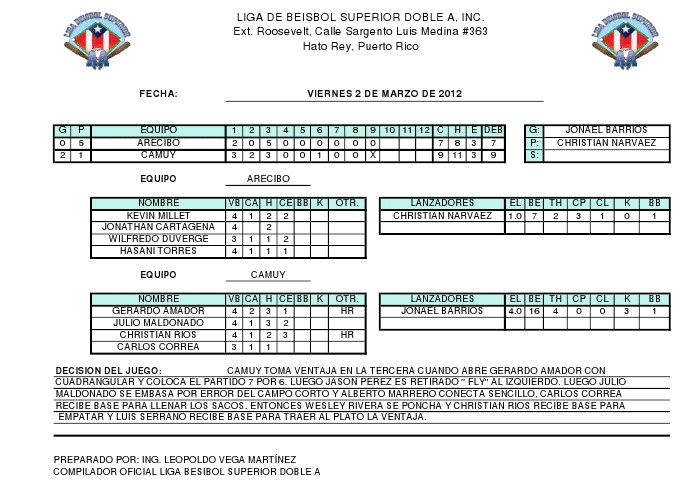 En el partido del viernes 9 de marzo el Camuy Arenas obtuvo su tercera victoria en linea, al vencer 5 carreras por 3 a los Atenienses de Manatí. La victoria cayó sobre el novato Jonuel Martinez siendo esta su primera en el beisbol doble A, mientras que la derrota fue para el zurdo Jesus Carnevale y juego salvado para Jonael Barrios. Por Camuy: Chris Amador conecto cuadrangular con dos compañeros a bordo.