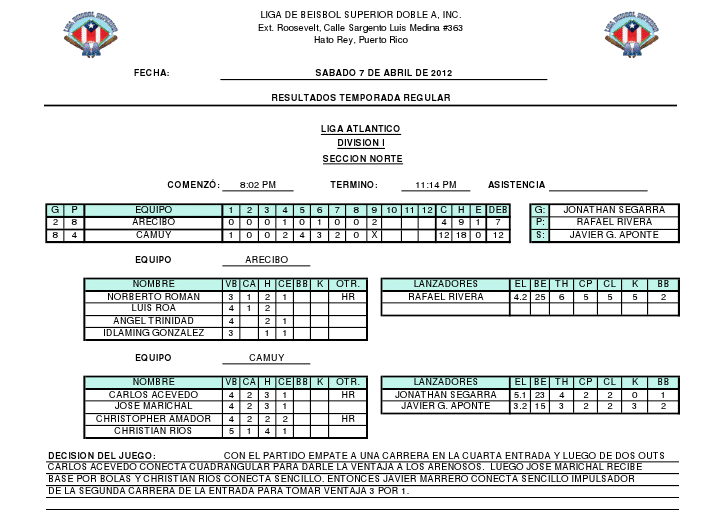 Los Arenosos de Camuy dominaron a los Lobos de Arecibo 12 carreras por 4 en la acción del sábado 7 de abril, en partido donde se conectaron 4 cuadrangulares. La victoria es para el zurdo Jonathan Segarra, mientras que la derrota cayó sobre Rafa Rivera. Por Arecibo bateó de Home Run, Norberto Román mientras que por Camuy se fueron para la calle Carlos Acevedo, Alberto Marrero & Christopher Amador.