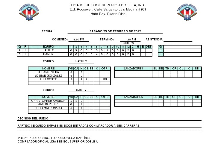 El primer juego de Camuy en la campaña 2012 será en su estadio local el viernes 17 de febrero, cuando reciban la visita de los Tigres de Hatillo.
