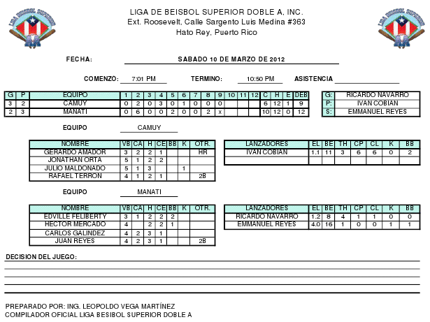 En el segundo encuentro del fin se semana entre Camuy & Manati, los Atenienses salieron por la puerta ancha al vencer 10 carreras por 6 a los Arenosos. La victoria fue para Ricardo Navarro con juego salvado para Emmanuel Reyes, mientras que la derrota fue para Ivan Cobian. Por Camuy: Gerardo Amador (3-2, HR);Jonathan Orta (5-2); Julio Maldonado (5-3); Rafael Terron (4-2).